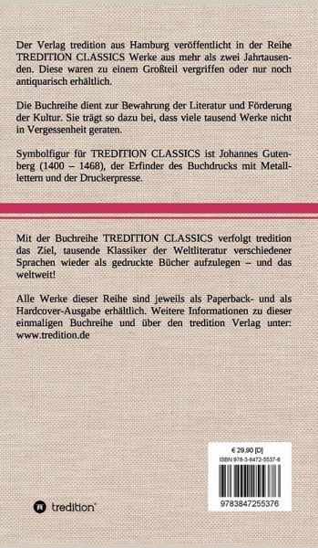 Diese Hardcover-Ausgabe ist Teil der TREDITION CLASSICS. Der Verlag tredition aus Hamburg veröffentlicht in der Buchreihe TREDITION CLASSICS Werke aus mehr als zwei Jahrtausenden. Diese waren zu einem Großteil vergriffen oder nur noch antiquarisch erhältlich. Mit TREDITION CLASSICS verfolgt tredition das Ziel, tausende Klassiker der Weltliteratur verschiedener Sprachen wieder als gedruckte Bücher zu verlegen und das weltweit! Die Buchreihe dient zur Bewahrung der Literatur und Förderung der Kultur. Sie trägt so dazu bei, dass viele tausend Werke nicht in Vergessenheit geraten.