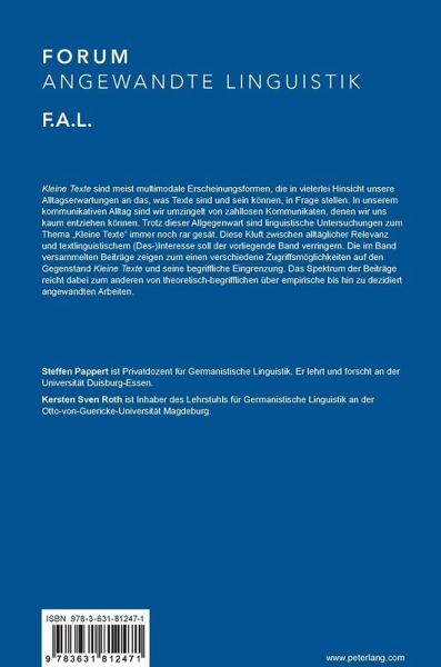 Kleine Texte sind meist multimodale Erscheinungsformen, die in vielerlei Hinsicht unsere Alltagserwartungen an das, was Texte sind und sein können, in Frage stellen. In unserem kommunikativen Alltag sind wir umzingelt von zahllosen Kommunikaten, denen wir uns kaum entziehen können. Trotz dieser Allgegenwart sind linguistische Untersuchungen zum Thema «Kleine Texte» immer noch rar gesät. Diese Kluft zwischen alltäglicher Relevanz und textlinguistischem (Des-)Interesse soll der vorliegende Band verringern. Die im Band versammelten Beiträge zeigen zum einen verschiedene Zugriffsmöglichkeiten auf den Gegenstand Kleine Texte und seine begriffliche Eingrenzung. Das Spektrum der Beiträge reicht dabei zum anderen von theoretisch-begrifflichen über empirische bis hin zu dezidiert angewandten Arbeiten.