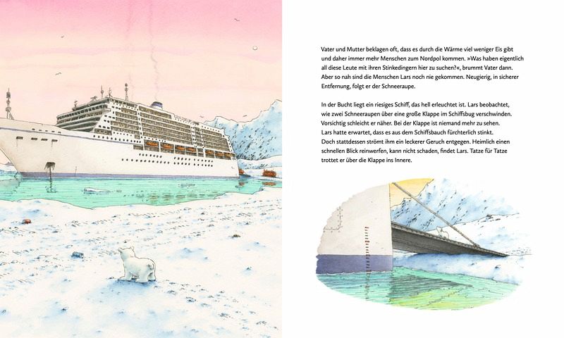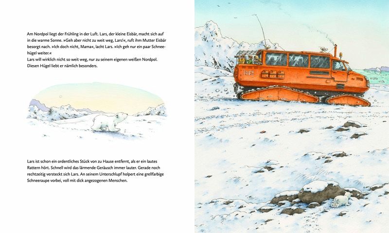 Selbst in der Arktis wimmelt es vor Touristen. In großen, bunten Schneefahrzeugen sind sie plötzlich überall. Neugierig will Lars sie eigentlich nur ein bisschen beobachten. Und dem verführerischen Duft aus dem Schiffsbauch auf den Grund gehen . . . Rumms! Die Klappe geht vor seiner Nase zu und das Schiff setzt sich in Bewegung. Bevor Lars weiß, wie ihm geschieht, steckt er bereits mitten im Abenteuer und findet sich am Ende der Reise in China wieder. Mit tatkräftiger Unterstützung seiner neuen Freunde Hei und Bai kann auch die Chinesische Mauer Lars nicht davon abhalten, seinen Weg nach Hause zu finden. Im bereits 12. Abenteuer des kleinen Eisbären lässt uns Hans de Beer an einer weiteren großen Reise teilhaben. Seine zarten Wasserfarbenillustrationen geben chinesische Bambuswälder genauso gut wieder wie weitläufige Schneelandschaften.