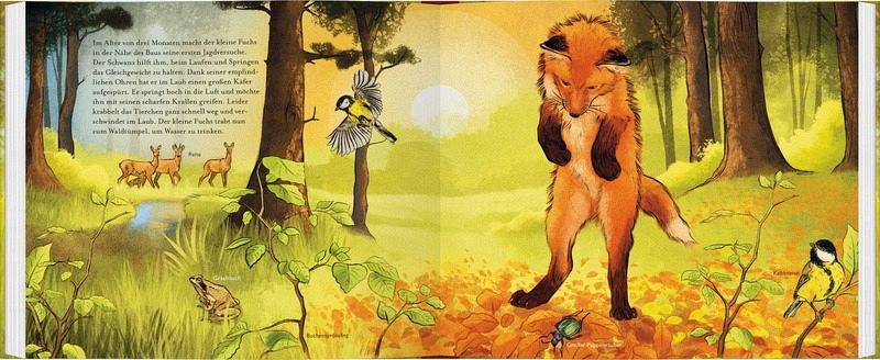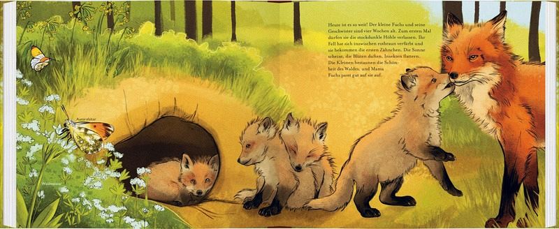 Zu Beginn liegt der kleine Fuchs sicher und geborgen bei seiner Mutter und seinen Geschwistern in der warmen Höhle. Die ersten Lebenswochen sind geprägt von Spielen, Herumtollen und neugierigen Erkundungen. Schritt für Schritt lernt er von seiner Mutter alles, was er für das Leben draußen im Wald braucht: Wo es Nahrung gibt, wie man leise und geschickt schleicht, und woran er Gefahren erkennt. Dabei fließen auf natürliche Weise spannende Sachinformationen ein – etwa zu den Lieblingsspeisen des Fuchses, zu seinen Sinnen oder zu typischen Waldbewohnern und Pflanzen, die ihm begegnen.