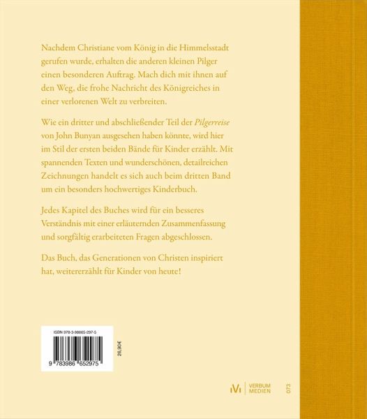 Nachdem Christiane vom König in die Himmelsstadt gerufen wurde, erhalten die anderen kleinen Pilger einen besonderen Auftrag. Mach dich mit ihnen auf den Weg, die frohe Nachricht des Königreiches in einer verlorenen Welt zu verbreiten. Wie ein dritter und abschließender Teil der Pilgerreise von John Bunyan ausgesehen haben könnte, wird hier im Stil der ersten beiden Bände für Kinder erzählt. Mit spannenden Texten und wunderschönen, detailreichen Zeichnungen handelt es sich auch beim dritten Band um ein besonders hochwertiges Kinderbuch. Jedes Kapitel des Buches wird für ein besseres Verständnis mit einer erläuternden Zusammenfassung und sorgfältig erarbeiteten Fragen abgeschlossen. Das Buch, das Generationen von Christen inspiriert hat, weitererzählt für Kinder von heute!