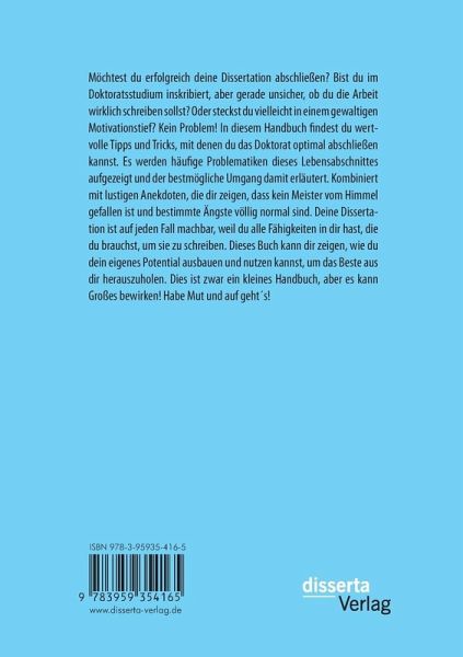 Möchtest du erfolgreich deine Dissertation abschließen? Bist du im Doktoratsstudium inskribiert, aber gerade unsicher, ob du die Doktorarbeit wirklich schreiben sollst? Oder steckst du vielleicht in einem gewaltigen Motivationstief? Kein Problem! In diesem kleinen Handbuch findest du wertvolle Tipps und Tricks mit denen du das Doktorat optimal abschließen kannst. Seien es formale Informationen, psychische Hilfestellungen, motivierende Übungen oder diverse Empfehlungen, wie du mit deinem Umfeld besser klarkommst. Es werden hier häufige Problematiken dieses Lebensabschnittes aufgezeigt und der bestmögliche Umgang damit erläutert. Kombiniert mit lustigen Anekdoten, die dir zeigen, dass kein Meister vom Himmel gefallen ist und bestimmte Zweifel und Ängste völlig normal sind. Deine Arbeit ist auf jeden Fall machbar, weil du alle Fähigkeiten in dir hast, die du brauchst, um eine Dissertation zu schreiben. Dieses Buch kann dir zeigen, wie du dein eigenes Potential ausbauen und nutzen kannst, um das Beste aus dir herauszuholen. Dies ist zwar ein kleines Handbuch, aber es kann Großes bewirken! Habe Mut und auf geht's!