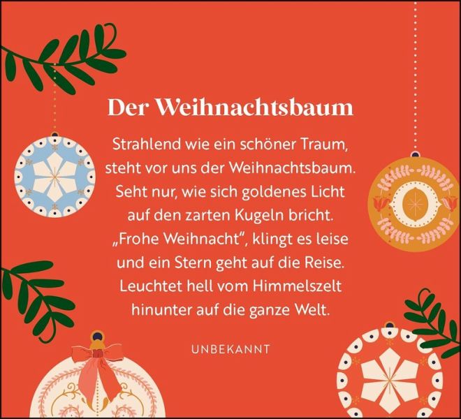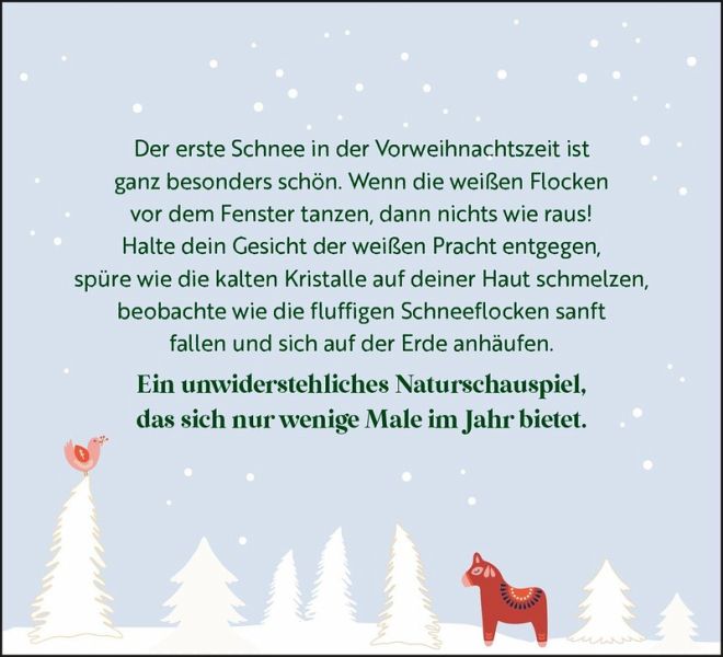 Der kleine, atmosphärische Aufsteller zelebriert die Adventszeit und befeuert die weihnachtliche Vorfreude. Nostalgische Illustrationen sind eingebunden in ein liebevolles Design. Zusammen mit besinnlichen Texten und Zitaten, die auf wundervolle Weise auf Weihnachten einstimmen, wird dieses Aufstellbuch zu einem perfekten Mitbringsel für Freunde und Familie. Der dekorative Spiralaufsteller begleitet durch den Advent und schenkt dem Betrachter jeden Tag ein bisschen Weihnachtsglück!