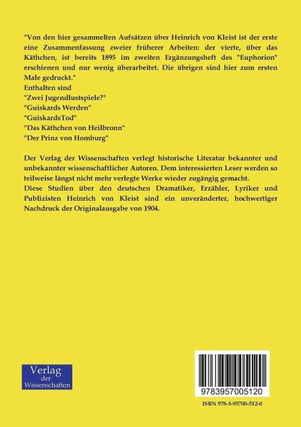 Diese Studien über den deutschen Dramatiker, Erzähler, Lyriker und Publizisten Heinrich von Kleist sind ein unveränderter, hochwertiger Nachdruck der Originalausgabe von 1904.
