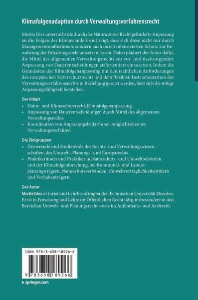 Moritz Gies untersucht die durch das Natura 2000-Recht geforderte Anpassung an die Folgen des Klimawandels und zeigt, dass sich diese nicht nur durch Managementmaßnahmen, sondern auch durch intensivierten Schutz zur Bewahrung der Erhaltungsziele umsetzen lassen. Dabei plädiert der Autor dafür, die Mittel des allgemeinen Verwaltungsrechts zur vor- und nachsorgenden Anpassung von Dauerentscheidungen zielorientiert einzusetzen. Indem die Grundsätze der Klimafolgenanpassung mit den rechtlichen Anforderungen des europäischen Naturschutzrechts und dem flexiblen Instrumentarium des Verwaltungsverfahrensrechts in Beziehung gesetzt werden, lässt sich die nötige Anpassungsfähigkeit herstellen.