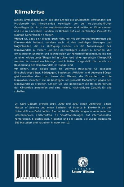 Dieses umfassende Buch soll den Lesern ein gründliches Verständnis der Problematik des Klimawandels vermitteln, von den wissenschaftlichen Grundlagen bis hin zu den sozioökonomischen und politischen Dimensionen, und sie zu sinnvollem Handeln im Hinblick auf eine nachhaltige Zukunft für künftige Generationen anregen.Wichtig ist, dass sich dieses Buch nicht nur mit den Herausforderungen des Klimawandels befasst, sondern auch mit den unzähligen Lösungen und Möglichkeiten, die zur Verfügung stehen, um die Auswirkungen des Klimawandels zu mildern und eine nachhaltigere Zukunft zu schaffen. Von erneuerbaren Energien und Technologien zur Kohlenstoffabscheidung bis hin zu einer widerstandsfähigen Infrastruktur und einer gerechten Klimapolitik werden die innovativen Lösungen und Initiativen vorgestellt, die bereits zur Bekämpfung des Klimawandels im Gange sind.Wir hoffen, dass dieses Buch als wertvolle Ressource für politische Entscheidungsträger, Pädagogen, Studenten, Aktivisten und besorgte Bürger gleichermaßen dient und ihnen das Wissen, die Einsichten und die Inspiration vermittelt, die sie benötigen, um sinnvolle Maßnahmen gegen den Klimawandel zu ergreifen. Lassen Sie uns gemeinsam die Herausforderung der Klimakrise annehmen und eine hellere, nachhaltigere Zukunft für alle schaffen.