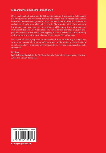 Diese mathematisch orientierte Einführung in typische Klimamodelle stellt anhand konkreter Modelle den Prozess von der Modellbildung über die mathematische Analyse bis zur konkreten Umsetzung (Simulation) am Rechner in den Mittelpunkt. Dabei werden auch die zur Simulation wichtigen Bereiche der Mathematik und der Informatik wie Entwicklung und Konvergenz von Algorithmen und Umgang mit hochdimensionalen Problemen behandelt. Viel Wert wird auf eine verständliche Erklärung der Grundprinzipien der mathematischen Modellbildung gelegt, sowie im Weiteren auf Diskretisierung und Algorithmenentwicklung und deren Umsetzung auf dem Computer.