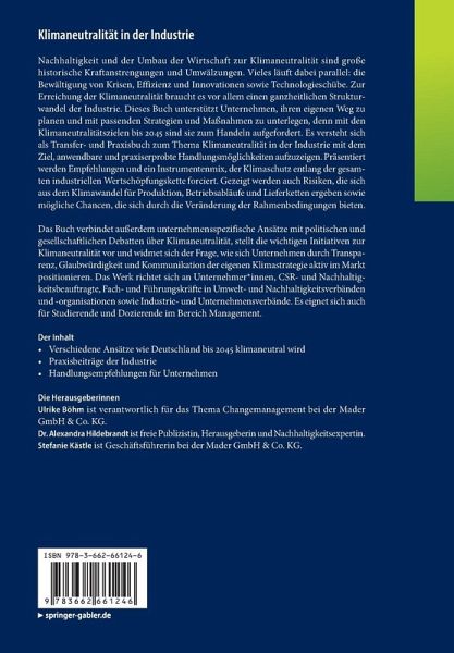Nachhaltigkeit und der Umbau der Wirtschaft zur Klimaneutralität sind große historische Kraftanstrengungen und Umwälzungen. Vieles läuft dabei parallel: die Bewältigung von Krisen, Effizienz und Innovationen sowie Technologieschübe. Zur Erreichung der Klimaneutralität braucht es vor allem einen ganzheitlichen Strukturwandel der Industrie. Dieses Buch unterstützt Unternehmen, ihren eigenen Weg zu planen und mit passenden Strategien und Maßnahmen zu unterlegen, denn mit den Klimaneutralitätszielen bis 2045 sind sie zum Handeln aufgefordert. Es versteht sich als Transfer- und Praxisbuch zum Thema Klimaneutralität in der Industrie mit dem Ziel, anwendbare und praxiserprobte Handlungsmöglichkeiten aufzuzeigen. Präsentiert werden Empfehlungen und ein Instrumentenmix, der Klimaschutz entlang der gesamten industriellen Wertschöpfungskette forciert. Gezeigt werden auch Risiken, die sich aus dem Klimawandel für Produktion, Betriebsabläufe und Lieferketten ergeben sowie mögliche Chancen, die sichdurch die Veränderung der Rahmenbedingungen bieten.Das Buch verbindet außerdem unternehmensspezifische Ansätze mit politischen und gesellschaftlichen Debatten über Klimaneutralität, stellt die wichtigen Initiativen zur Klimaneutralität vor und widmet sich der Frage, wie sich Unternehmen durch Transparenz, Glaubwürdigkeit und Kommunikation der eigenen Klimastrategie aktiv im Markt positionieren. Das Werk richtet sich an Unternehmer_innen, CSR- und Nachhaltigkeitsbeauftragte, Fach- und Führungskräfte in Umwelt- und Nachhaltigkeitsverbänden und -organisationen sowie Industrie- und Unternehmensverbände. Es eignet sich auch für Studierende und Dozierende im Bereich Management.