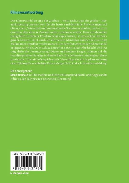 Der Klimawandel ist eine der größten - wenn nicht sogar die größte - Herausforderung unserer Zeit. Bereits heute sind deutliche Auswirkungen auf Ökosysteme, Wirtschaft und soziokulturelle Strukturen spürbar, und es ist zu erwarten, dass diese in Zukunft weiter zunehmen werden. Dass wir Menschen maßgeblich zu diesem Problem beigetragen haben, ist inzwischen überwiegender Konsens. Auch sind sich die meisten Menschen darüber bewusst, dass Maßnahmen ergriffen werden müssen, um dem fortschreitenden Klimawandel entgegenzuwirken. Doch welche konkreten Schritte sind erforderlich? Und wer trägt dafür die Verantwortung? Diesen und anderen Fragen widmen sich die interdisziplinären Beiträge in diesem Buch. Die Diskussion wird ergänzt durch praxisnahe Unterrichtsbeispiele sowie Vorschläge für die Implementierung einer Bildung für nachhaltige Entwicklung (BNE) in der Lehrkräfteausbildung.
