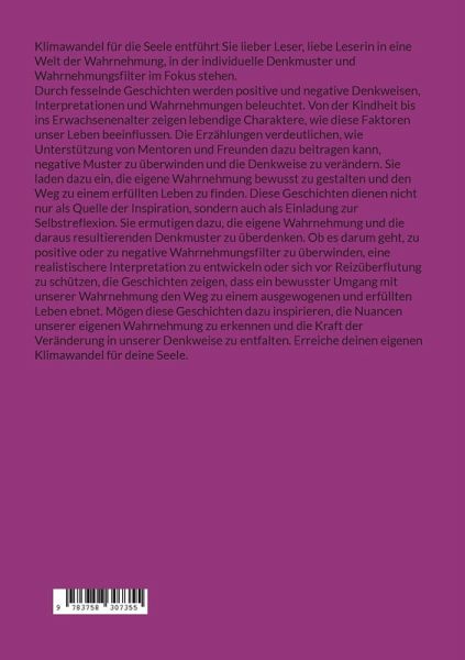 Klimawandel für die Seele entführt Sie lieber Leser, liebe Leserin in eine Welt der Wahrnehmung, in der individuelle Denkmuster und Wahrnehmungsfilter im Fokus stehen. Durch fesselnde Geschichten werden positive und negative Denkweisen, Interpretationen und Wahrnehmungen beleuchtet. Von der Kindheit bis ins Erwachsenenalter zeigen lebendige Charaktere, wie diese Faktoren unser Leben beeinflussen. Die Erzählungen verdeutlichen, wie Unterstützung von Mentoren und Freunden dazu beitragen kann, negative Muster zu überwinden und die Denkweise zu verändern. Sie laden dazu ein, die eigene Wahrnehmung bewusst zu gestalten und den Weg zu einem erfüllten Leben zu finden. Diese Geschichten dienen nicht nur als Quelle der Inspiration, sondern auch als Einladung zur Selbstreflexion. Sie ermutigen dazu, die eigene Wahrnehmung und die daraus resultierenden Denkmuster zu überdenken. Ob es darum geht, zu positive oder zu negative Wahrnehmungsfilter zu überwinden, eine realistischere Interpretation zu entwickeln oder sich vor Reizüberflutung zu schützen, die Geschichten zeigen, dass ein bewusster Umgang mit unserer Wahrnehmung den Weg zu einem ausgewogenen und erfüllten Leben ebnet. Mögen diese Geschichten dazu inspirieren, die Nuancen unserer eigenen Wahrnehmung zu erkennen und die Kraft der Veränderung in unserer Denkweise zu entfalten. Erreiche deinen eigenen Klimawandel für deine Seele.
