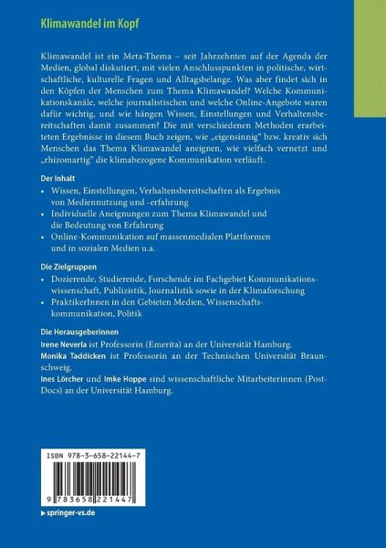Klimawandel ist ein Meta-Thema - seit Jahrzehnten auf der Agenda der Medien, global diskutiert, mit vielen Anschlusspunkten in politische, wirtschaftliche, kulturelle Fragen und Alltagsbelange. Was aber findet sich in den Köpfen der Menschen zum Thema Klimawandel? Welche Kommunikationskanäle, welche journalistischen und welche Online-Angebote waren dafür wichtig, und wie hängen Wissen, Einstellungen und Verhaltensbereitschaften damit zusammen? Die mit verschiedenen Methoden erarbeiteten Ergebnisse in diesem Buch zeigen, wie ,eigensinnig' bzw. kreativ sich Menschen das Thema Klimawandel aneignen, wie vielfach vernetzt und ,rhizomartig' die klimabezogene Kommunikation verläuft.