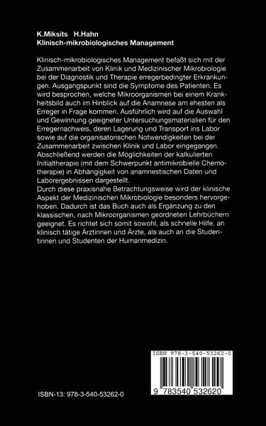 Infektionen des Zentralen Nervensystems.- Augeninfektionen.- Infektionen des Ohres.- Sinusitis.- Pharyngitis/Tonsillitis.- Epiglottitis.- Infektionen des unteren Respirationstrakts.- Harnwegsinfektionen (Zystitis, Pyelonephritis).- Infektionen des Genitaltrakts.- Erregerbedingte Darmerkrankungen.- Peritonitis.- Intraabdominelle Infektionen (ohne Darmerkrankungen und Peritonitis).- Infektionen der Haut.- Wundinfektionen.- Erregerbedingte Arthritis.- Osteomyelitis.- Sepsis und Bakteriämie.- Endokarditis.- Mykobakterien: Untersuchungsmaterial, Management.- Viren: Untersuchungsmaterialien, Organlokalisation.- Typische Antibiotikaempfindlichkeiten einzelner Bakteriengenera.- Hinweise auf die Dosierung häufig verwendeter antimikrobieller Substanzen.- Algorithmus zur serologischen Diagnostik der Syphilis.- Erregerspektrum bei Immunkompromittierten.- Zeitspannen für die Erstellung mikrobiologischer (bakteriologischer) Befunde.- Gesetzliche Bestimmungen: Auszug aus dem Bundesseuchengesetz.- Postverfügungen und DIN-Normen.- Weiterführende Literatur.