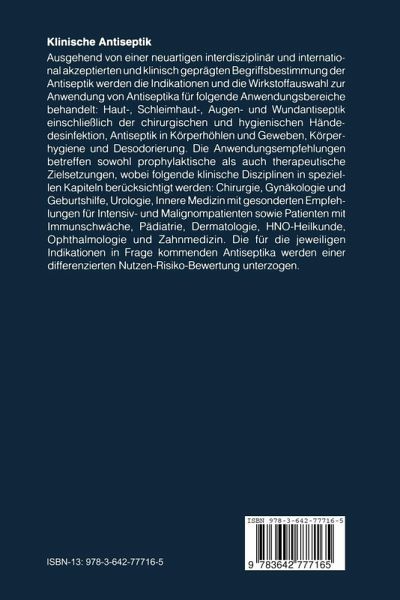 1 Begriffsbestimmung der Antiseptik und Zielstellung der klinischen Anwendung von Antiseptika.- 1 Infektiologische Bedeutung der Mikroflora episomatischer Biotope.- 2 Begriffsbestimmung der Antiseptik.- 3 Zielsetzung antiseptischer Maßnahmen.- 3.1 Prophylaktische Antiseptik.- 3.1.1 Einmalige bzw. kurzfristige prophylaktische Antiseptik.- 3.1.2 Mehrmalige bzw. langfristige prophylaktische Antiseptik.- 3.2 Therapeutische Antiseptik.- 4 Mikrobiologische und klinische Anforderungen an Antiseptika.- Literatur.- 2 Wirkungsspektrum und Anwendungseigenschaften häufig aus prophylaktischer Indikation angewandter Antiseptika.- 1 Anforderungen an die Wirksamkeit.- 2 Anforderungen an die Verträglichkeit.- 3 Anforderungen an die mikrobielle Reinheit.- 4 Charakteristik ausgewählter antiseptischer Wirkstoffe.- Literatur.- 3 Chirurgische Händedesinfektion.- 1 Zielsetzung.- 2 Anforderungen.- 2.1 Wirkungsspektrum.- 2.2 Ausmaß der Keimzahlverminderung unmittelbar nach Anwendung (Sofortwirkung).- 2.3 Nachwirkung.- 2.3.1 Remanente Wirkung.- 2.3.2 Andere Formen der Nachwirkung.- 3 Wirkstoffe.- 4 Durchführung.- 5 Hautverträglichkeit.- Literatur.- 4 Hygienische Händedesinfektion.- 1 Zielstellung.- 2 Wirkungsspektrum.- 3 Wirkstoffe.- 4 Verträglichkeit.- 5 Indikationen und Durchführung.- Literatur.- 5 Gesunde Haut als Voraussetzung für eine effektive Händedesinfektion.- 1 Anatomische und physiologische Bedingungen.- 2 Pathophysiologische Befunde.- 3 Beurteilung der Verträglichkeit von Methoden der Händehygiene.- 4 Verbesserung der Verträglichkeit von hygienischer Händewaschung und -desinfektion.- Literatur.- 6 Hautantiseptik.- 1 Mikrobiologische Kurzcharakteristik des Biotops.- 2 Bedeutung der Hautflora für die Entstehung von Infektionen.- 3 Wirkstoffe zur Hautantiseptik undihre Anwendungsmöglichkeiten.- 3.1 Alkohole (Ethanol, 1-Propanol, 2-Propanol).- 3.2 Polyvinylpyrrolidon-(PVP)-Iod.- 3.3 Wirkstoffe mit Tensidcharakter.- 3.4 Sonstige Wirkstoffe.- 4 Anwendungsgebiete der Hautantiseptik.- 5 Mikrobiologische Prüfung von Hautantiseptika.- 6 Durchführung der Hautantiseptik.- 6.1 Einmalige prophylaktische Hautantiseptik.- 6.2 Wiederholte prophylaktische Hautantiseptik.- Literatur.- 7 Körperhygiene.- 1 Grundlagen der Reinigung und Pflege des Körpers.- 1.1 Reinigung und Pflege der Haut.- 1.1.1 Reinigung und Keimzahlverminderung durch Seifenwaschung.- 1.1.2 Bedeutung antiseptischer Zusätze zu Körperreinigungsmitteln.- 1.1.3 Reinigung und Keimzahlverminderung durch Baden und Duschen.- 1.1.4 Reinigung und Keimzahlverminderung durch Wässer und Cremes.- 1.1.5 Dermatologische Anforderungen an Körperreinigungsmittel.- 1.1.6 Anforderungen an die Keimarmut in Hautreinigungs- und Hautpflegemitteln.- 1.1.7 Einfluß der Bekleidung auf die Mikroflora.- 1.2 Mundhygiene.- 1.3 Ohrenpflege.- 1.4 Intimhygiene.- 2 Praxis der Körperhygiene und Sauberkeitsnormen.- 2.1 Allgemeine Grundsätze.- 2.2 Besonderheiten in Gesundheitseinrichtungen.- 2.2.1 Mitarbeiter.- 2.2.2 Patienten.- Literatur.- 8 Desodorierung.- 1 Geruchsquellen.- 1.1 Allgemeine mikrobielle Umsetzung.- 1.2 Individualbereich.- 2 Beseitigung spezieller Gerüche des Individualbereiches.- 2.1 Raumluftqualitätsverbesserung.- 2.2 Körperpflege.- 2.2.1 Wirkprinzip der Antiperspirantien (Antihydrotika, Schweißbekämpfungsmittel) und Desodorantien.- 2.2.2 Wirkstoffe bzw. Verfahren zur Geruchsbekämpfung.- Literatur.- 9 Wundantiseptik.- 1 Grundlagen der Wundheilung.- 2 Gefährdung der Wundheilung durch Infektionen.- 3 Allgemeine Prinzipien der Wundbehandlung.- 4 Wundantiseptik.- 4.1 AllgemeineGrundsätze.- 4.2 Antiseptische Indikationen und Wirkstoffauswahl in Abhängigkeit von der Art der Wunden.- 4.2.1 Traumatogene Wunde.- 4.2.2 Chirurgische Wunde.- 4.2.3 Verbrennungswunde.- 4.2.4 Ulcus cruris, Decubitus und andere schlecht heilende sekundäre Wunden.- 4.2.5 Peritoneallavage.- 4.2.6 Therapie von Wundinfektionen.- 5 Bearbeitungsschwerpunkte für die weitere Verbesserung der Wundbehandlung.- Literatur.- 10 Vaginalantiseptik.- 1 Charakteristik der Vaginalflora.- 2 Klinische und infektiologische Bedeutung einer Kolonisation oder Infektion.- 3 Zielsetzung für eine Anwendung von Antiseptika.- 4 Anforderungen an die Wirksamkeit von Antiseptika.- Literatur.- 11 Antiseptik in der Urologie.- 1 Epidemiologie der Harnwegsinfektionen.- 2 Natürliche Infektionsabwehr am Harntrakt.- 3 Ätiopathogenese von Harnwegsinfektionen.- 4 Antiseptische Maßnahmen in der Urologie.- 4.1 Gegenwärtige Situation und Zielsetzung.- 4.2 Überblick über gebräuchliche Antiseptika.- 4.3 Indikationsgruppen.- 4.3.1 Prophylaktische Antiseptik.- 4.3.1.1 Harnblasenkatheterismus.- 4.3.1.2 Endoskopische und endourologische Eingriffe.- 4.3.1.3 Pflege und Antiseptik der Urostomata.- 4.3.2 Lokale therapeutische Antiseptik.- 5 Schlußfolgerungen.- Literatur.- 12 Antiseptik in der HNO-Heilkunde.- 1 Erregerspektrum von HNO-Infektionen.- 2 Indikationsprinzipien für die therapeutische Antiseptik.- Literatur.- 13 Antiseptische Sanierung von Staphylococcus aureus-Keimträgern in der Nase.- 1 Epidemiologie von S. aureus-Infektionen.- 2 Lokal verabreichte Antiseptika und Antibiotika.- 3 Systemisch verabreichte Antibiotika.- 4 Schlußfolgerungen.- Literatur.- 14 Antiseptik am Auge.- 1 Mikrobielle Besiedelung und Infektionen des Auges.- 2 Anwendungsbereiche von Antiseptika am Auge.- 3 Klinische Anwendungvon Antiseptika und Antibiotika am Auge.- 3.1 Allgemeine Grundsätze.- 3.2 Prophylaktische Indikationen.- 3.3 Therapeutische Antiseptik.- Literatur.- 15 Antiseptik in der Mundhöhle.- 1 Die Mundhöhle als Ausgangspunkt von Infektionen.- 1.1 Mundhöhlenflora.- 1.2 Infektionsrisiken.- 1.3 Zielstellung antiseptischer Maßnahmen.- 2 Indikationen und Effektivität antiseptischer Maßnahmen.- 2.1 Antiseptische Mundspülung im Rahmen der zahnärztlichen Behandlung.- 2.2 Antiseptische Mundspülung bzw. -pflege bei hospitalisierten Risikopatienten.- 2.3 Antiseptische Mundpflege bei Kieferfrakturen mit intermaxilläre