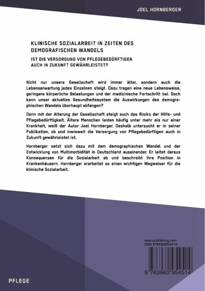 Nicht nur unsere Gesellschaft wird immer älter, sondern auch die Lebenserwartung jedes Einzelnen steigt. Dazu tragen eine neue Lebensweise, geringere körperliche Belastungen und der medizinische Fortschritt bei. Doch kann unser aktuelles Gesundheitssystem die Auswirkungen des demographischen Wandels überhaupt abfangen?Denn mit der Alterung der Gesellschaft steigt auch das Risiko der Hilfe- und Pflegebedürftigkeit. Ältere Menschen leiden häufig unter mehr als nur einer Krankheit, weiß der Autor Joel Hornberger. Deshalb untersucht er in seiner Publikation, ob und inwieweit die Versorgung von Pflegebedürftigen auch in Zukunft gewährleistet ist.Hornberger setzt sich dazu mit dem demographischen Wandel und der Entwicklung von Multimorbidität in Deutschland auseinander. Er leitet daraus Konsequenzen für die Sozialarbeit ab und beschreibt ihre Position in Krankenhäusern. Hornberger erarbeitet so einen wichtigen Wegweiser für die klinische Sozialarbeit.Aus dem Inhalt:- Gesundheitswesen;-Pflegedienst;- Pflegeheim;- ambulante Nachsorge;- stationäre Nachsorge