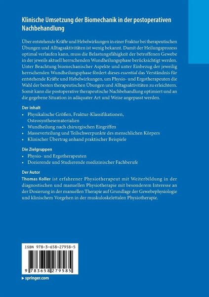 Über entstehende Kräfte und Hebelwirkungen in einer Fraktur bei therapeutischen Übungen und Alltagsaktivitäten ist wenig bekannt. Damit der Heilungsprozess optimal verlaufen kann, muss die Belastungsfähigkeit der betroffenen Gewebe in der jeweils aktuell herrschenden Wundheilungsphase berücksichtigt werden. Unter Beachtung biomechanischer Aspekte und unter Einbezug der jeweilig herrschenden Wundheilungsphase fördert dieses essential das Verständnis für entstehende Kräfte und Hebelwirkungen, um Physio- und Ergotherapeuten die Wahl der besten therapeutischen Übungen und Alltagsaktivitäten zu erleichtern. Somit kann die postoperative therapeutische Nachbehandlung optimiert und an die gegebene Situation in adäquater Art und Weise angepasst werden.