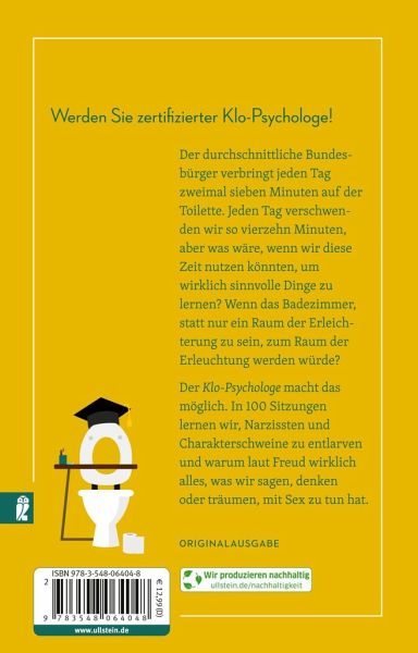 Der durchschnittliche Bundesbürger verbringt jeden Tag zweimal sieben Minuten auf der Toilette. Jeden Tag verschwenden wir so vierzehn Minuten, aber was wäre, wenn wir diese Zeit nutzen könnten, um wirklich sinnvolle Dinge zu lernen? Wenn das Badezimmer, statt nur ein Raum der Erleichterung zu sein, zum Raum der Erleuchtung werden würde? Der Klo-Psychologe macht das möglich. In 100 Sitzungen lernen wir Narzissten und Psychopathen zu entlarven und warum laut Freud wirklich alles, was wir sagen, denken oder träumen mit Sex zu tun hat.