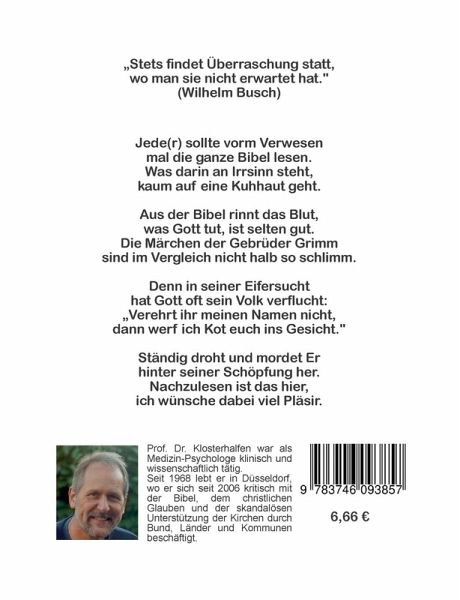 Die Bibel ist ein böses Buch, der Menschheit wurde sie zum Fluch.Zwar hat sie auch paar gute Stellen, doch mehr gibt´s von den kriminellen. Jeder sollte vorm Verwesen mal die ganze Bibel lesen.Was darin an Irrsinn steht, kaum auf eine Kuhhaut geht. Grausam sind des Herren Werke, Mitleid ist nicht seine Stärke. Grausam ist er von Natur, lieb ist er ganz selten nur. Aus der Bibel rinnt das Blut, was Gott tut, ist selten gut. Ständig droht und mordet er hinter seiner Schöpfung her. Die Märchen der Gebrüder Grimm sind im Vergleich nicht halb so schlimm. Nachzulesen ist das hier, ich wünsche dabei viel Pläsir. Wolfgang Klosterhalfen