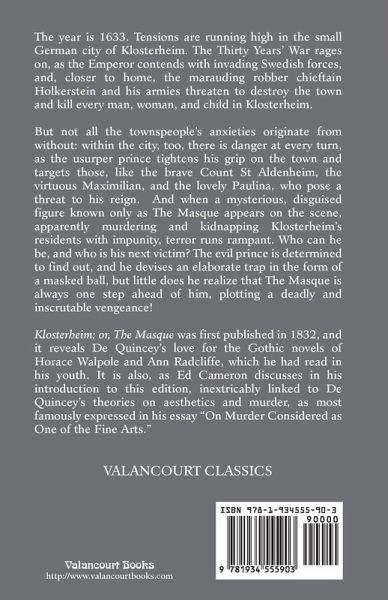 The year is 1633. Tensions are running high in the small German city of Klosterheim. The Thirty Years' War rages on, as the Emperor contends with invading Swedish forces, and, closer to home, the marauding robber chieftain Holkerstein and his armies threaten to destroy the town and kill every man, woman, and child in Klosterheim. But not all the townspeople's anxieties originate from without: within the city, too, there is danger at every turn, as the usurper prince tightens his grip on the town and targets those, like the brave Count St Aldenheim, the virtuous Maximilian, and the lovely Paulina, who pose a threat to his reign. And when a mysterious, disguised figure known only as The Masque appears on the scene, apparently murdering and kidnapping Klosterheim's residents with impunity, terror runs rampant. Who can he be, and who is his next victim? The evil prince is determined to find out, and he devises an elaborate trap in the form of a masked ball, but little does he realize that The Masque is always one step ahead of him, plotting a deadly and inscrutable vengeance! Klosterheim; or, The Masque was first published in 1832, and it reveals De Quincey's love for the Gothic novels of Horace Walpole and Ann Radcliffe, which he had read in his youth. It is also, as Ed Cameron discusses in his introduction to this edition, inextricably linked to De Quincey's theories on aesthetics and murder, as most famously expressed in his essay "On Murder Considered as One of the Fine Arts."