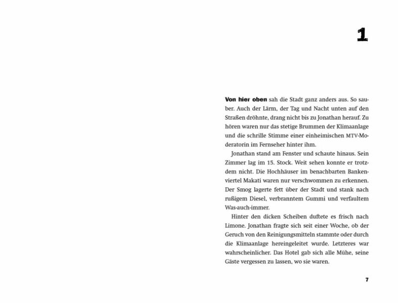 Eigentlich befindet sich Jonathan mit seinem Vater, der aus Manila kommt, und seiner Mutter im Urlaub. Unserer Hauptfigur wird es schnell langweilig die ganze Verwandschaft zu besuchen und er beschliesst seine zweite Heimat einmal alleine zu erkunden. Aufgrund der Tatsache das Jonathan in der Grossstadt Berlin aufgewachsen ist und die Landessprache Manilas (Tagalog) spricht fuehlt er sich sicher, schliesslich kann Manila ja nicht schlimmer sein als die schlimmsten Ecken in Berlin. Wie sehr sich unser Protagonist taeuscht laesst sich schon am Anfang der Geschichte erahnen. Jonathan verlaeuft sich und landet in einer der aermsten Ecken der Stadt, wird dort von einer Strassenkindergang ausgeraubt und zusammengeschlagen.