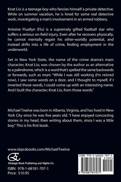 Knat Lio is a teenage boy who fancies himself a private detective. While on summer vacation, he is hired for some real detective work, investigating a man's involvement in an armed robbery. Antoine Fluellyn (Flu) is a supremely gifted football star who suffers a serious on-field injury. Even after he recovers physically, he cannot mentally regain his other-worldly potential, and instead drifts into a life of crime, finding employment in the underworld. Set in New York State, the name of the crime drama's main character, Knat Lio, was chosen by the author as an alternative to a palindrome, which is a word that's spelled the same backwards or forwards, such as mom. "While I was still working (I'm retired now), I saw some words on a door, and I thought to myself, if I inverted those words, I could come up with an interesting name. And I built the character; Knat Lio, from those words." (About the Author) Michael Twelve was born in Alberta, Virginia, and has lived in New York City since he was five years old. "I have enjoyed concocting stories in my head, then writing about them, since I was a little boy." This is his first book.