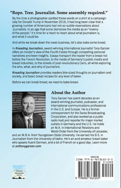 "Rope. Tree. Journalist. Some assembly required." By the time a photographer spotted these words on a shirt at a campaign rally for Donald Trump in November 2016, it had long been clear that a growing number of Americans had not-so-subtle reservations about journalists. In an age that some demonize the media as an "enemy of the people," it's time for a heart-to-heart about what journalism is, and what it could be. And while we break down the news business, let's also bake some bread. In Kneading Journalism, award-winning international journalist Tony Ganzer provides an insider's view of the Fourth Estate through compelling personal narratives and keen insights. Essays transport the reader from a bread riot before the French Revolution, to the inside of Germany's public media and bread industries, to the streets of post-revolutionary Cairo, all while exploring the who, what, and why of journalism. Kneading Journalism provides readers bite-sized thoughts on journalism and society, and basic bread recipes for any level of baker. Before we can break bread, we need to bake bread.