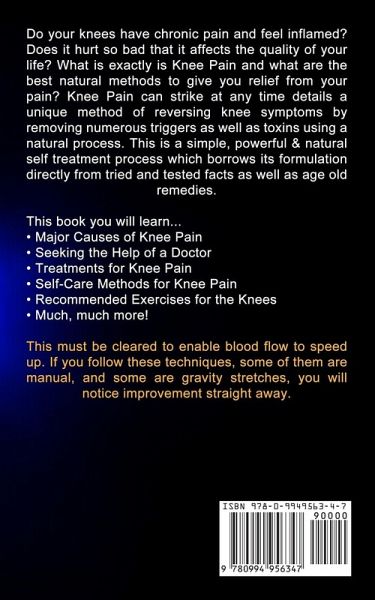 Do your knees have chronic pain and feel inflamed? Does it hurt so bad that it affects the quality of your life? What is exactly is Knee Pain and what are the best natural methods to give you relief from your pain? Knee Pain can strike at any time details a unique method of reversing knee symptoms by removing numerous triggers as well as toxins using a natural process. This is a simple, powerful & natural self treatment process which borrows its formulation directly from tried and tested facts as well as age old remedies. This book you will learn...Major Causes of Knee Pain Seeking the Help of a Doctor Treatments for Knee Pain Self-Care Methods for Knee Pain Recommended Exercises for the Knees Much, much more! This must be cleared to enable blood flow to speed up. If you follow these techniques, some of them are manual, and some are gravity stretches, you will notice improvement straight away.