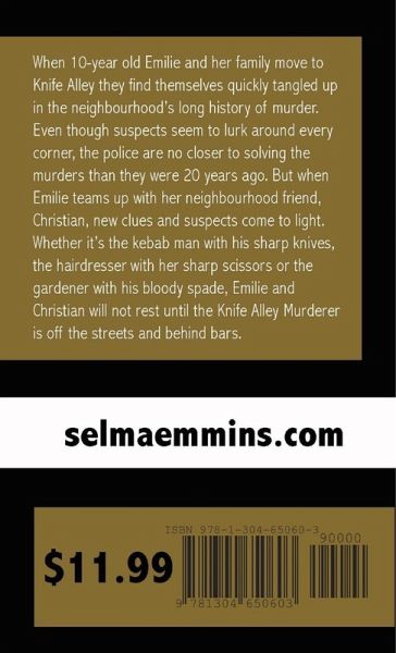 When 10-year old Emilie and her family move to Knife Alley they find themselves quickly tangled up in the neighbourhood's long history of murder. Even though suspects seem to lurk around every corner, the police are no closer to solving the murders than they were 20 years ago. But when Emilie teams up with her neighbourhood friend, Christian, new clues and suspects come to light. Whether it's the kebab man with his sharp knives, the hairdresser with her sharp scissors or the gardener with his bloody spade, Emilie and Christian will not rest until the Knife Alley Murderer is off the streets and behind bars.