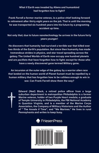 What if Earth was invaded by Aliens and humankind had forgotten how to fight? Frank Farrell a former marine veteran, is a police chief looking forward to retirement after thirty eight years on the job. That is until the morning he was transported six hundred years into his future by a programing accident up time. Not only that; due to future nanotechnology he arrives in the future forty years younger! He discovers that humanity had survived a terrible war that killed over two thirds of the Earth's population. But since then humanity has made tremendous strides in physics, and star travel spreading across the galaxy. The United Worlds of Earth now occupy one hundred planets and are pacifists that have forgotten how to fight; except for those who have a newly discovered gene termed Military gene. An incursion at the outer edge of the galaxy by a warrior alien race that landed on the human world of Planet Sunset must be repelled by a human military that has forgotten how to be ruthless enough to win in war. Can Frank Farrell show them the way?
