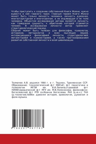 Chtoby pristupit' k sozdaniü sobstwennoj Knigi Zhizni, nuzhno wywesti w nej glawnogo geroq. Glawnym geroem Knigi Zhizni mozhet byt' tol'ko lichnost' cheloweka, lichnost' duhownaq, mnogostrukturnaq i mnogogrannaq, a ne indiwiduum i ne telo cheloweka. Ob#ektom issledowaniq awtora qwlqetsq lichnost' kak triedinaq suschnost', k obreteniü kotoroj stremitsq chelowek. V issledowanii lichnosti awtor primenqet strukturologicheskij podhod. Sbornik mozhet byt' polezen dlq filosofow, psihologow, istorikow, metodologow i wseh myslqschih lüdej, interesuüschihsq filosofiej lichnosti, strukturologiej, metaistoriej i psihoistoriej, a takzhe prognozirowaniem razwitiq sobstwennoj lichnosti i wsej ciwilizacii.
