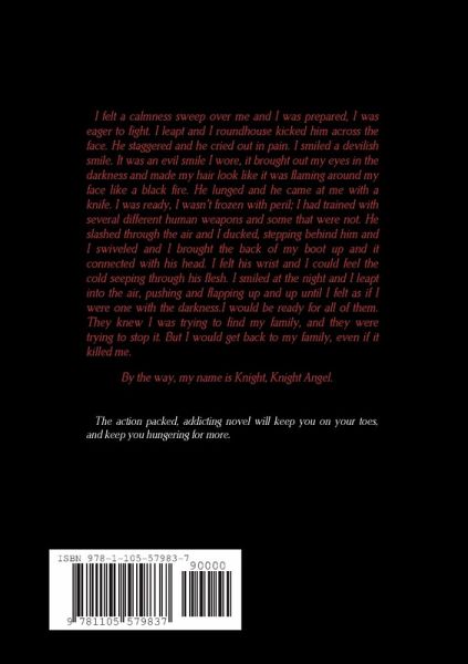 Knight Angel is a Angel/Night Angel, she was ripped away from her families by Night Walkers, she is now fighting to get back to them. From fighting possesed humans to tall mythological creatures that will do anything to keep her from getting to her families, Knight has to survive. Knight has to get back to her families, she is the Akisaya, or the Yin-yang of the two mortal enemies. To survive, she befriends a mysterious boy named Darren, who is probably a lost Angel, yet he dosent remember his past. She starts to have dreams, dreams about a woman with black hair, and a man with white, both trying to catch her as she dissapears, then black curtians come around her, What is this dream? Why does she somehow recognize these people, and why cant she stop dreaming about them? She dosent know but she will find out . The action packed, addicting novel will keep you on your toes, and keep you hungering for more.