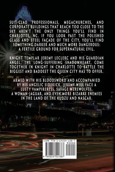 Suit-clad professionals, megachurches, and corporate buildings that reach too close to the sky aren't the only things you'll find in Charlotte, NC. If you look past the polished glass and steel façade of the city, you'll find something darker and much more dangerous: a fertile ground for supernatural evil. Knight Templar Jeremy LeClerc and his guardian angel, the long-suffering Shadowheart, come together in Knight in Charlotte to battle the biggest and Baddest the Queen City has to offer. Armed with his bloodsword and accompanied by his angelic sidekick, Jeremy will face a lusty vampires, savage werewolves, a woman-jaguar, and even more bizarre enemies in the land of Kudzu and NASCAR.