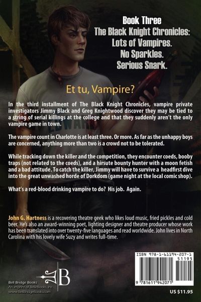 Lots of Vampires. No Sparkles. Serious Snark. Et tu, Vampire? The boys discover they may be tied to a string of serial killings at the college and that they suddenly aren't the only vampire game in town. The vampire count in Charlotte is at least three. Or more. As far as the unhappy boys are concerned, anything more than two is a crowd not to be tolerated. While tracking down the killer and the competition, they encounter coeds, booby traps (not related to the coeds) and a hirsute bounty hunter with a moon fetish and a bad attitude. To catch the killer, Jimmy will have to survive a dive headfirst into the great unwashed horde of Dorkdom (game night at the local comic shop). What's a red-blood-drinking vampire to do? His job. Again. John G. Hartness is a recovering theatre geek who likes loud music, fried pickles and cold beer. He's also an award-winning poet, lighting designer and theatre producer whose work has been translated into over twenty-five languages and read worldwide. John lives in North Carolina with his lovely wife Suzy and writes full-time.