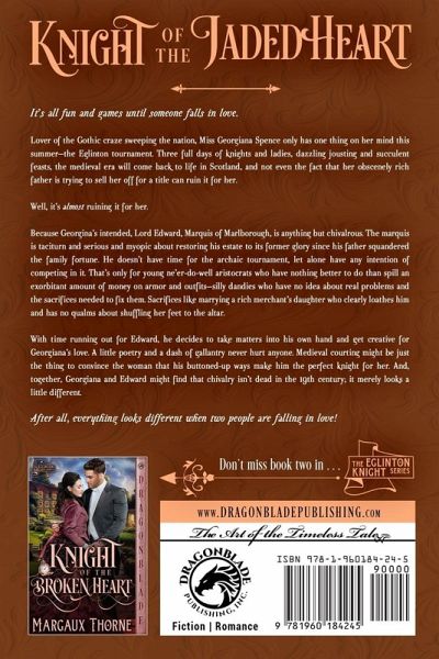 It's all fun and games until someone falls in love. Lover of the Gothic craze sweeping the nation, Miss Georgiana Spence only has one thing on her mind this summer-the Eglinton tournament. Three full days of knights and ladies, dazzling jousting and succulent feasts, the medieval era will come back to life in Scotland, and not even the fact that her obscenely rich father is trying to sell her off for a title can ruin it for her. Well, it's almost ruining it for her. Because Georgina's intended, Lord Edward, Marquis of Marlborough, is anything but chivalrous. The marquis is taciturn and serious and myopic about restoring his estate to its former glory since his father squandered the family fortune. He doesn't have time for the archaic tournament, let alone have any intention of competing in it. That's only for young ne'er-do-well aristocrats who have nothing better to do than spill an exorbitant amount of money on armor and outfits-silly dandies who have no idea about real problems and the sacrifices needed to fix them. Sacrifices like marrying a rich merchant's daughter who clearly loathes him and has no qualms about shuffling her feet to the alter. With time running out for Edward, he decides to take matters into his own hand and get creative for Georgiana's love. A little poetry and a dash of gallantry never hurt anyone. Medieval courting might be just the thing to convince the woman that his buttoned-up ways make him the perfect knight for her. And, together, Georgiana and Edward might find that chivalry isn't dead in the 19th century; it merely looks a little different. After all, everything looks different when two people are falling in love! The Eglinton Knight Series Book 1 - Knight of the Jaded Heart Book 2 - Knight of the Wicked Heart Book 3 - Knight of the Bleeding Heart Book 4 - Knight of the Broken Heart
