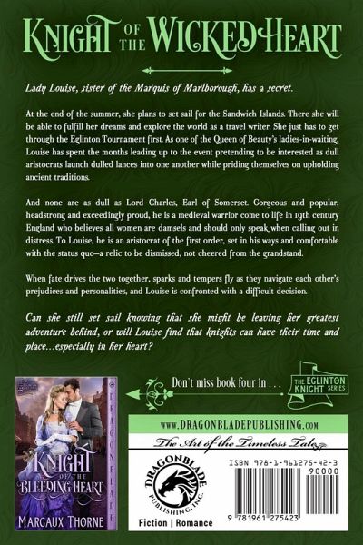 Lady Louise, sister of the Marquis of Marlborough, has a secret. At the end of the summer, she plans to set sail for the Sandwich Islands. There she will be able to fulfill her dreams and explore the world as a travel writer. She just has to get through the Eglinton Tournament first. As one of the Queen of Beauty's ladies-in-waiting, Louise has spent the months leading up to the event pretending to be interested as dull aristocrats launch dulled lances into one another while priding themselves on upholding ancient traditions. And none are as dull as Lord Charles, Earl of Somerset. Gorgeous and popular, headstrong and exceedingly proud, he is a medieval warrior come to life in 19th century England who believes all women are damsels and should only speak when calling out in distress. To Louise, he is an aristocrat of the first order, set in his ways and comfortable with the status quo-a relic to be dismissed, not cheered from the grandstand. When fate drives the two together, sparks and tempers fly as they navigate each other's prejudices and personalities, and Louise is confronted with a difficult decision. Can she still set sail knowing that she might be leaving her greatest adventure behind, or will Louise find that knights can have their time and place ... especially in her heart? ¿The Eglinton Knight Series Book 1 - Knight of the Jaded Heart Book 2 - Knight of the Broken Heart Book 3 - Knight of the Wicked Heart Book 4 - Knight of the Bleeding Heart