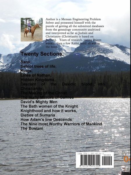 Twenty Sections of Genealogy and Christianity based study. Using all the databases on the internet related to religion and genealogy and throwing out the one that could not be real and using the good ones, and finding the esoteric ones and combining into the book. The book has an improved Sarai for the pregnant women, the many mirrors of Galilee, the Five Generation Genesis of God, the making of David the first Christ and the present Christ, and how the new one is greater and related to the first Christ. Studies of Kings, Hidden Kingdoms, Israelites, numerous genealogy charts, ArchAngels, books of the Bible. Ever wonder where these people are in ancestry or the Father?