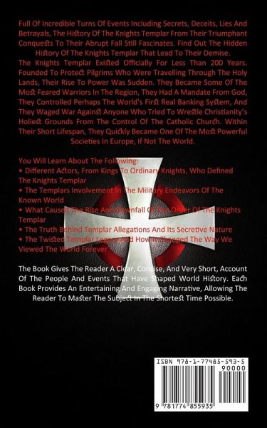 Full Of Incredible Turns Of Events Including Secrets, Deceits, Lies And Betrayals, The History Of The Knights Templar From Their Triumphant Conquests To Their Abrupt Fall Still Fascinates. Find Out The Hidden History Of The Knights Templar That Lead To Their Demise. The Knights Templar Existed Officially For Less Than 200 Years. Founded To Protect Pilgrims Who Were Travelling Through The Holy Lands, Their Rise To Power Was Sudden. They Became Some Of The Most Feared Warriors In The Region, They Had A Mandate From God, They Controlled Perhaps The World's First Real Banking System, And They Waged War Against Anyone Who Tried To Wrestle Christianity's Holiest Grounds From The Control Of The Catholic Church. Within Their Short Lifespan, They Quickly Became One Of The Most Powerful Societies In Europe, If Not The World. You Will Learn About The Following:Different Actors, From Kings To Ordinary Knights, Who Defined The Knights Templar The Templars Involvement In The Military Endeavors Of The Known World What Caused The Rise And Downfall Of The Order Of The Knights Templar The Truth Behind Templar Allegations And Its Secretive Nature The Twisted Templar Legacy And How It Changed The Way We Viewed The World Forever The Book Gives The Reader A Clear, Concise, And Very Short, Account Of The People And Events That Have Shaped World History. Each Book Provides An Entertaining And Engaging Narrative, Allowing The Reader To Master The Subject In The Shortest Time Possible.