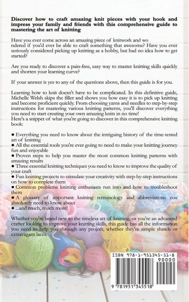 Discover how to craft amazing knit pieces with your hook and impress your family and friends with this comprehensive guide to mastering the art of knitting Have you ever come across an amazing piece of knitwork and wondered if you'd ever be able to craft something that awesome? Have you ever seriously considered picking up knitting as a hobby, but had no idea how to get started? Are you ready to discover a pain-free, easy way to master knitting skills quickly and shorten your learning curve? If your answer is yes to any of the questions above, then this guide is for you. Learning how to knit doesn't have to be complicated. In this definitive guide, Michelle Welsh skips the filler and shows you how easy it is to pick up knitting and become proficient quickly. From choosing yarns and needles to step-by-step instructions for mastering various knitting patterns, you'll discover everything you need to start creating your own amazing knits in no time! Here's a snippet of what you're going to discover in this comprehensive knitting book: * Everything you need to know about the intriguing history of the time-tested art of knitting * All the essential tools you're ever going to need to make your knitting journey fun and enjoyable * Proven steps to help you master the most common knitting patterns with amazing results * Three essential knitting techniques you need to know to improve the quality of your craft * Fun knitting projects to stimulate your creativity with step-by-step instructions on how to complete them * Common problems knitting enthusiasts run into and how to troubleshoot them * A glossary of important knitting terminology and abbreviations you absolutely need to know about * ...and much, much more! Whether you're brand new to the timeless art of knitting, or you're an advanced crafter looking to improve your knitting skills, this guide has all the information you need to help you through any project, whether they're simple shawls or extravagant laces. Scroll to the top of the page and click the "Buy Now with 1-Click" button to get started on your knitting adventure today!