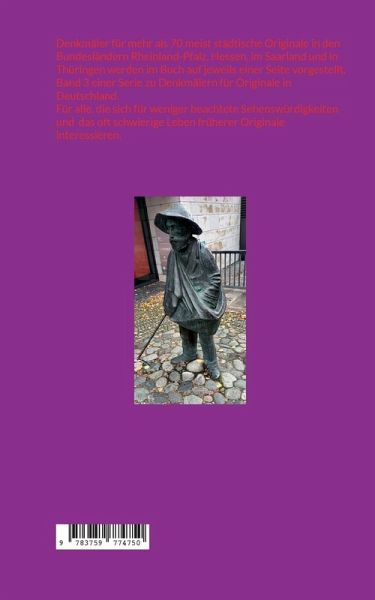 Denkmäler für mehr als 70 meist städtische Originale in den Bundesländern Rheinland-Pfalz, Hessen, im Saarland und in Thüringen werden im Buch auf jeweils einer Seite vorgestellt. Band 3 einer Serie zu Denkmälern für Originale in Deutschland. Für alle, die sich für weniger beachtete Sehenswürdigkeiten und das oft schwierige Leben früherer Originale interessieren.