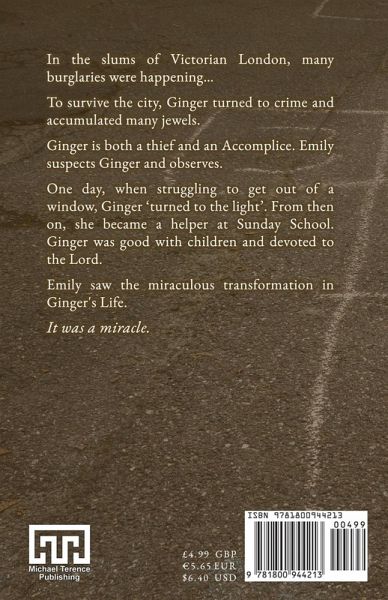 In the slums of Victorian London, many burglaries were happening... To survive the city, Ginger turned to crime and accumulated many jewels. Ginger is both a thief and an Accomplice. Emily suspects Ginger and observes. One day, when struggling to get out of a window, Ginger 'turned to the light'. From then on, she became a helper at Sunday School. Ginger was good with children and devoted to the Lord. Emily saw the miraculous transformation in Ginger's Life. It was a miracle.