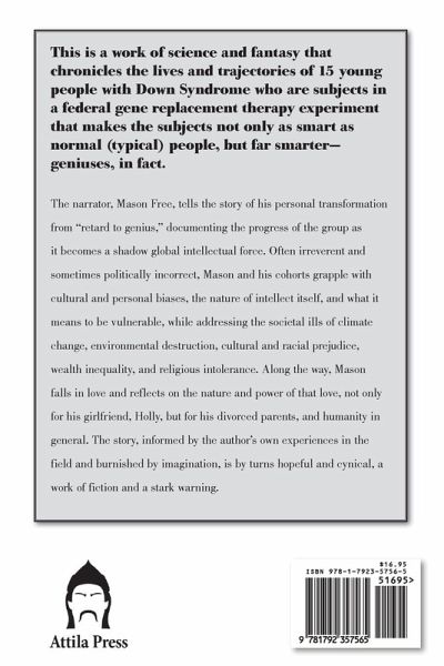 This is a work of science and fantasy that chronicles the lives and trajectories of 15 young people with Down Syndrome who are subjects in a federal gene replacement therapy experiment that makes the subjects not only as smart as normal (typical) people, but far smarter-geniuses, in fact. The narrator, Mason Free, tells the story of his personal transformation from "retard to genius," documenting the progress of the group as it becomes a shadow global intellectual force. Often irreverent and sometimes politically incorrect, Mason and his cohorts grapple with cultural and personal biases, the nature of intellect itself, and what it means to be vulnerable, while addressing the societal ills of climate change, environmental destruction, cultural and racial prejudice, wealth inequality, and religious intolerance. Along the way, Mason falls in love and reflects on the nature and power of that love, not only for his girlfriend, Holly, but for his divorced parents, and humanity in general. The story, informed by the author's own experiences in the field and burnished by imagination, is by turns hopeful and cynical, a work of fiction and a stark warning.