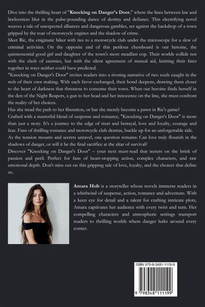Dive into the thrilling heart of "Knocking on Danger's Door," where the lines between law and lawlessness blur in the pulse-pounding dance of destiny and defiance. This electrifying novel weaves a tale of unexpected alliances and dangerous gambles, set against the backdrop of a town gripped by the roar of motorcycle engines and the shadow of crime. Meet Ric, the enigmatic biker with ties to a motorcycle club under the microscope for a slew of criminal activities. On the opposite end of this perilous chessboard is our heroine, the quintessential good girl and daughter of the town's most steadfast cop. Their worlds collide not with the clash of enemies, but with the silent agreement of mutual aid, knitting their fates together in ways neither could have predicted. "Knocking on Danger's Door" invites readers into a riveting narrative of two souls caught in the web of their own making. With each favor exchanged, their bond deepens, drawing them closer to the heart of darkness that threatens to consume their town. When our heroine finds herself in the den of the Night Reapers, a gun to her head and her innocence on the line, she must confront the reality of her choices. Has she tread the path to her liberation, or has she merely become a pawn in Ric's game? Crafted with a masterful blend of suspense and romance, "Knocking on Danger's Door" is more than just a story. It's a journey to the edge of trust and betrayal, love and loyalty, courage and fear. Fans of thrilling romance and motorcycle club dramas, buckle up for an unforgettable ride. As the tension mounts and secrets unravel, one question remains: Can love truly flourish in the shadows of danger, or will it be the final sacrifice at the altar of survival? Discover "Knocking on Danger's Door" - your next must-read that teeters on the brink of passion and peril. Perfect for fans of heart-stopping action, complex characters, and raw emotional depth. Don't miss out on this gripping tale of love, loyalty, and the choices that define us.