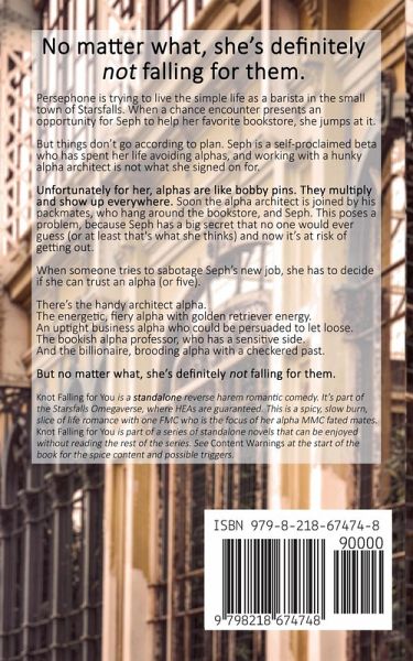 Persephone is trying to live the simple life as a barista in the small town of Starsfalls. When a chance encounter presents an opportunity for Seph to help her favorite bookstore, she jumps at it. But things don't go according to plan. Seph is a self-proclaimed beta who has spent her life avoiding alphas, and working with a hunky alpha architect is not what she signed on for. Unfortunately for her, alphas are like bobby pins. They multiply and show up everywhere. Soon the alpha architect is joined by his packmates, who hang around the bookstore, and Seph. This poses a problem, because Seph has a big secret that no one would ever guess (or at least that's what she thinks) and now it's at risk of getting out. When someone tries to sabotage Seph's new job, she has to decide if she can trust an alpha (or five). There's the handy architect alpha. The energetic, fiery alpha with golden retriever energy. An uptight business alpha who could be persuaded to let loose. The bookish alpha professor, who has a sensitive side. And the billionaire, brooding alpha with a checkered past. But no matter what, she's definitely not falling for them. Knot Falling for You is a standalone reverse harem romantic comedy. It's part of the Starsfalls Omegaverse, where HEAs are guaranteed. This is a spicy, slow burn, slice of life romance with one FMC who is the focus of her alpha MMC fated mates. Knot Falling for You is part of a series of standalone novels that can be enjoyed without reading the rest of the series.