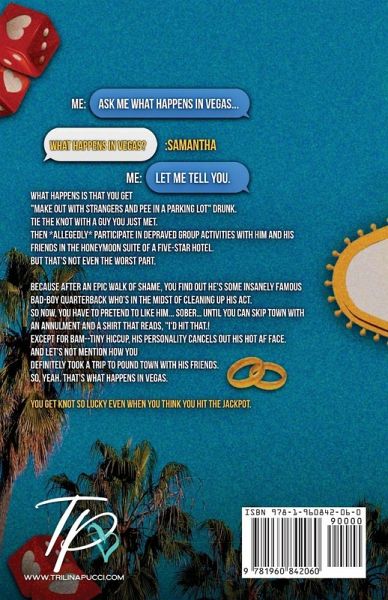 Me: Ask me what happens in Vegas... Samantha: What happens in Vegas? Me: Let me tell you. What happens is that you get "make out with strangers and pee in a parking lot" drunk. TIE THE KNOT WITH A GUY YOU JUST MET. Then *allegedly* participate in depraved group activities with him and his friends in the honeymoon suite of a five-star hotel. But that's not even the worst part. Because after an epic walk of shame, you find out he's some insanely famous bad-boy quarterback who's in the midst of cleaning up his act. So now, you have to pretend to like him... sober...until you can skip town with an…mehr