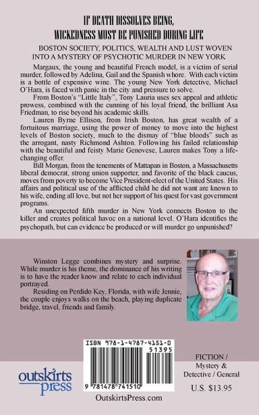 IF DEATH DISSOLVES BEING, WICKEDNESS MUST BE PUNISHED DURING LIFE BOSTON SOCIETY, POLITICS, WEALTH AND LUST WOVEN INTO A MYSTERY OF PSYCHOTIC MURDER IN NEW YORK Margaux, the young and beautiful French model, is a victim of serial murder, followed by Adelina, Gail and the Spanish whore. With each victim is a bottle of expensive wine. The young New York detective, Michael O'Hara, is faced with panic in the city and pressure to solve. >From Boston's "Little Italy", Tony Lauria uses sex appeal and athletic prowess, combined with the cunning of his loyal friend, the brilliant Asa Friedman, to rise beyond his academic skills. Lauren Byrne Ellison, from Irish Boston, has great wealth of a fortuitous marriage, using the power of money to move into the highest levels of Boston society, much to the dismay of "blue bloods" such as the arrogant, nasty Richmond Ashton. Following his failed relationship with the beautiful and feisty Marie Genovese, Lauren makes Tony a life-changing offer. Bill Morgan, from the tenements of Mattapan in Boston, a Massachusetts liberal democrat, strong union supporter, and favorite of the black caucus, moves from poverty to become Vice President-elect of the United States. His affairs and political use of the afflicted child he did not want are known to his wife, ending all love, but not her support of his quest for vast government programs. An unexpected fifth murder in New York connects Boston to the killer and creates political havoc on a national level. O'Hara identifies the psychopath, but can evidence be produced or will murder go unpunished?