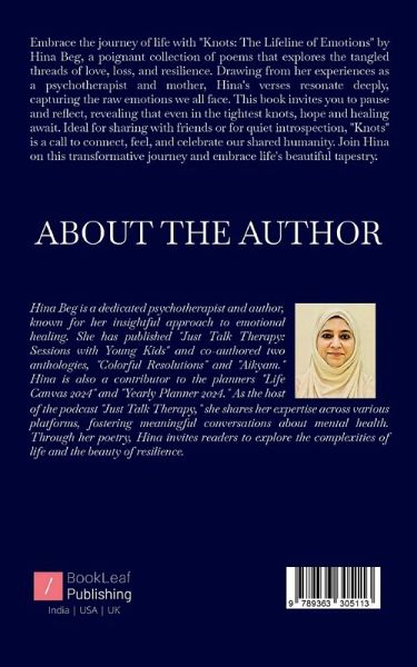 Embrace the journey of life with "Knots: The Lifeline of Emotions" by Hina Beg, a poignant collection of poems that explores the tangled threads of love, loss, and resilience. Drawing from her experiences as a psychotherapist and mother, Hina's verses resonate deeply, capturing the raw emotions we all face. This book invites you to pause and reflect, revealing that even in the tightest knots, hope and healing await. Ideal for sharing with friends or for quiet introspection, "Knots" is a call to connect, feel, and celebrate our shared humanity. Join Hina on this transformative journey and embrace life's beautiful tapestry.