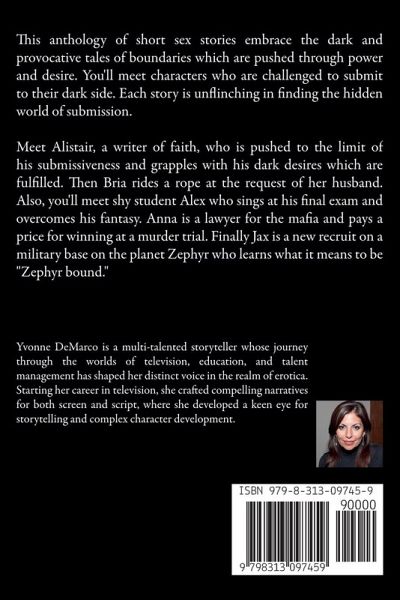 This anthology of short sex stories embrace the dark and provocative tales of boundaries which are pushed through power and desire. You'll meet characters who are challenged to submit to their dark side. Each story is unflinching in finding the hidden world of submission. Meet Alistair, a writer of faith, who is pushed to the limit of his submissiveness and grapples with his dark desires which are fulfilled. Then Bria rides a rope at the request of her husband. Also, you'll meet shy student Alex who sings at his final exam and overcomes his fantasy. Anna is a lawyer for the mafia and pays a price for winning at a murder trial. Finally Jax is a new recruit on a military base on the planet Zephyr who learns what it means to be "Zephyr bound."