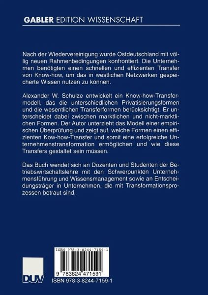 Alexander W. Schulze entwickelt ein Know-how-Transfermodell, das die unterschiedlichen Privatisierungsformen und die wesentlichen Transferformen berücksichtigt. Er unterscheidet dabei zwischen marktlichen und nicht-marktlichen Formen. Der Autor unterzieht das Modell einer empirischen Überprüfung und zeigt auf, welche Formen einen effizienten Kow-how-Transfer und somit eine erfolgreiche Unternehmenstransformation ermöglichen und wie diese Transfers gestaltet sein müssen.