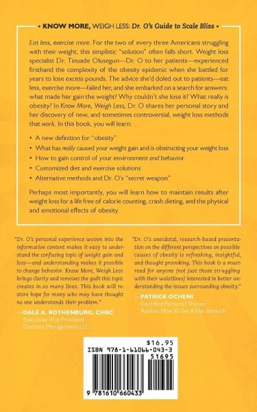 Eat less, exercise more. For the two of every three Americans struggling with their weight, this simplistic "solution" often falls short. Weight loss specialist Dr. Tinuade Olusegun—Dr. O to her patients—experienced firsthand the complexity of the obesity epidemic when she battled for years to lose excess pounds. The advice she'd doled out to patients—eat less, exercise more—failed her, and she embarked on a search for answers: what made her gain the weight? Why couldn't she lose it? What really is obesity? In Know More, Weigh Less, Dr. O shares her personal story and her discovery of new, and sometimes controversial, weight loss methods that work. In this book, you will learn: • A new definition for "obesity" • What has really caused your weight gain and is obstructing your weight loss • How to gain control of your environment and behavior • Customized diet and exercise solutions • Alternative methods and Dr. O's "secret weapon" Perhaps most importantly, you will learn how to maintain results after weight loss for a life free of calorie counting, crash dieting, and the physical and emotional effects of obesity.