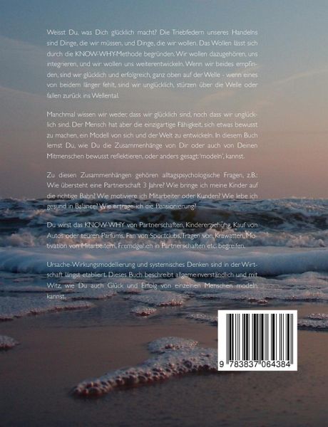 Weisst Du, was Dich glücklich macht? Die Triebfedern unseres Handelns sind Dinge, die wir müssen, und Dinge, die wir wollen. Das Wollen lässt sich durch die KNOW-WHY-Methode begründen. Wir wollen dazugehören, uns integrieren, und wir wollen uns weiterentwickeln. Wenn wir beides empfinden, sind wir glücklich und erfolgreich, ganz oben auf der Welle - wenn eines von beidem länger fehlt, sind wir unglücklich, stürzen über die Welle oder fallen zurück ins Wellental.Manchmal wissen wir weder, dass wir glücklich sind, noch dass wir unglücklich sind. Der Mensch hat aber die einzigartige Fähigkeit, sich etwas bewusst zu machen, ein Modell von sich und der Welt zu entwickeln. In diesem Buch lernst Du, wie Du die Zusammenhänge von Dir oder auch von Deinen Mitmenschen bewusst reflektieren, oder anders gesagt: 'modeln', kannst.Zu diesen Zusammenhängen gehören alltagspsychologische Fragen, z.B.: Wie übersteht eine Partnerschaft 3 Jahre? Wie bringe ich meine Kinder auf die richtige Bahn? Wie motiviere ich Mitarbeiter oder Kunden? Wie lebe ich gesund in Balance? Wie ertrage ich die Pensionierung?Du wirst das KNOW-WHY von Partnerschaften, Kindererziehung, Kauf von Autos oder teuren Parfums, Fan von Sportclubs, Tragen von Krawatten, Motivation von Mitarbeitern, Fremdgehen in Partnerschaften etc. begreifen.Ursache-Wirkungsmodellierung und systemisches Denken sind in der Wirtschaft längst etabliert. Dieses Buch beschreibt allgemeinverständlich und mit Witz, wie Du auch Glück und Erfolg von einzelnen Menschen modeln kannst.