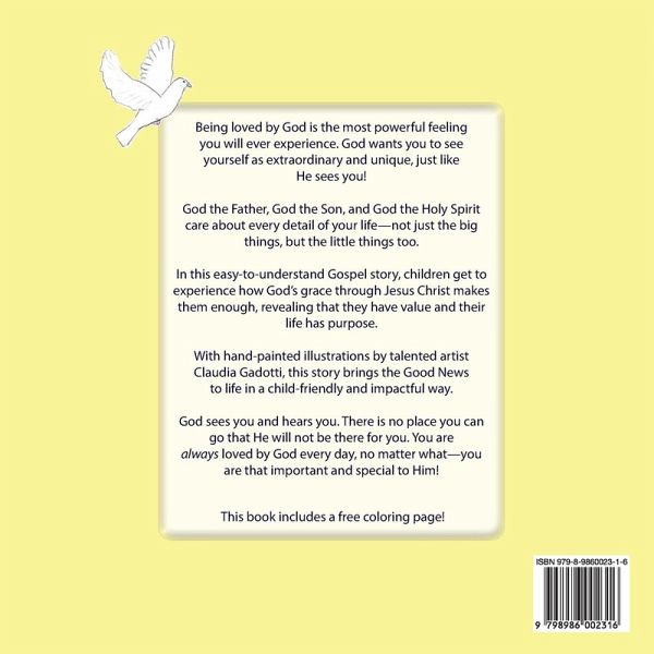 Being loved by God is the most powerful feeling you will ever experience. God wants you to see yourself as extraordinary and unique, just like He sees you! God the Father, God the Son, and God the Holy Spirit care about every detail of your life-not just the big things, but the little things too. In this easy-to-understand Gospel story, children get to experience how God's grace through Jesus Christ makes them enough, demonstrating that they have value and their life has purpose. With hand-painted illustrations by talented artist Claudia Gadotti, this story brings The Good News to life in a child-friendly and impactful way, God sees you and hears you. There is no place you can go that He will not be there for you. You are always loved by God every day, no matter what-you are that important and special to Him! This book reveals God the Father, God the Son, God the Holy Spirit and is designed to motivate the child to ask questions all throughout the story. Depending on their walk, each child's mindset will be different. Encourage the reader to allow for this. There is so much more to the story of Jesus that when discussed will result in growing in your faith. May God richly bless you as you hear His story. Use the content in this book to explore Scripture in the Bible. From 1 to 99 years old and beyond, if you don't know Jesus, allow this book to pierce your heart with His love. *This book includes a free coloring page* A portion of all proceeds goes to charity. Any questions contact HISway47@gmail.com